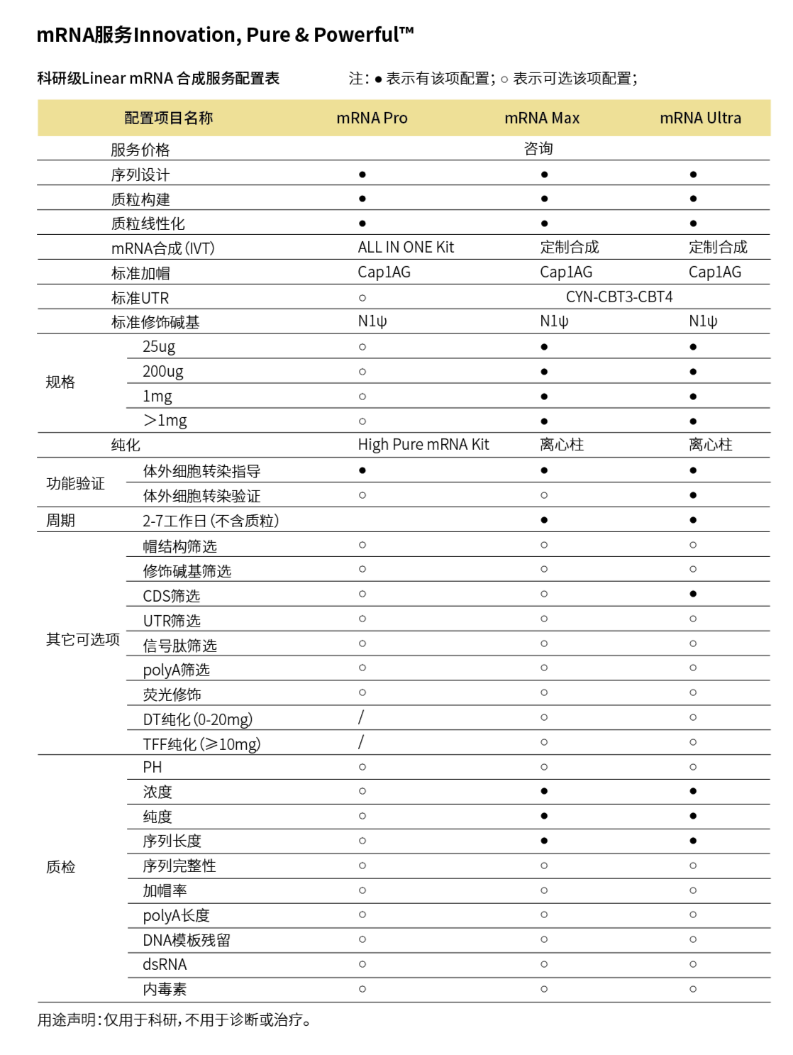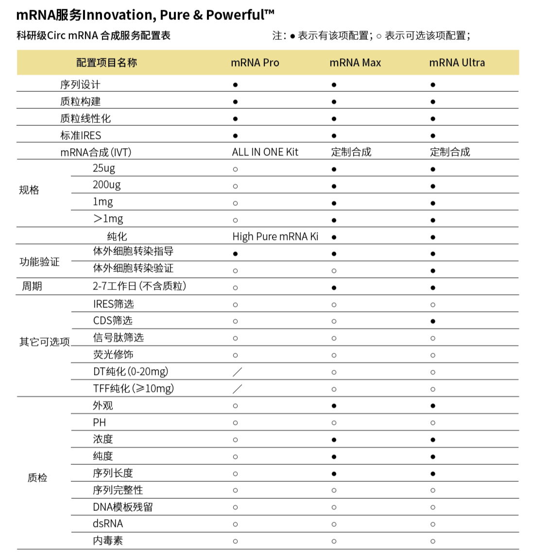 注:合信成面向客户提供可定制化服务,涵盖基因合成、质粒线性化及 IVT mRNA 合成等模块,形成灵活、模块化的端到端解决方案。更多升级服务详情请参阅 Ultra 套餐。